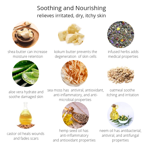 Ingredients: Distilled Water, Aloe Vera Juice, Shea Butter, Kokum Butter, Sea Moss, Hemp Seed Oil, Castor Oil, Neem Oil, Colloidal Oat, Emulsifying Wax, Stearic Acid, Infused Oil (Licorice Root, Red Clover, Dandelion Root, Calendula, Chamomile, Burdock, Juniper Berry, Sage, Eucalyptus), Lavender, Vitamin E, Optifine.